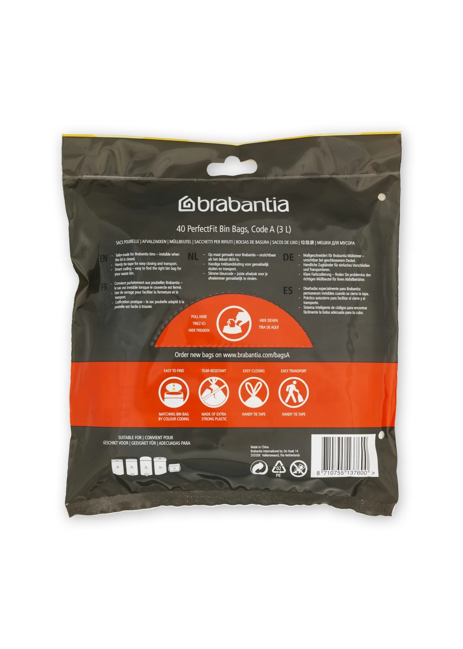 Brabantia perfectfit vuilniszakken zijn perfect voor je Brabantia prullenbak, en gemaakt om het leven gemakkelijker te maken. Dus zijn ze extra sterk, zitten ze in een handige dispenserverpakking en hebben ze een dito trekbandsluiting! Trek er de zak mee uit de emmer en knoop ‘m ermee dicht. Weet je niet zeker welke maat je nodig hebt, kijk dan naar de kleurcode aan de binnenkant van het deksel van je vuilnisbak. Geslaagde zakken, perfect passend bij je Brabantia afvalbak.