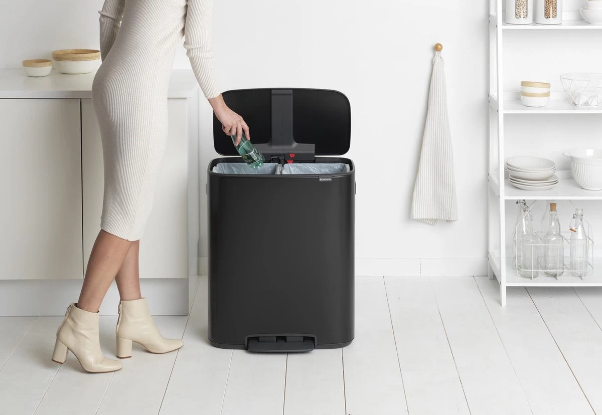 Let op: Deze vuilnisbak bevat twee binnenemmers van 30 liter, ideaal voor het scheiden van twee soorten afval. De Brabantia Bo prullenbak wordt geleverd inclusief een proefverpakking afvalzakken.