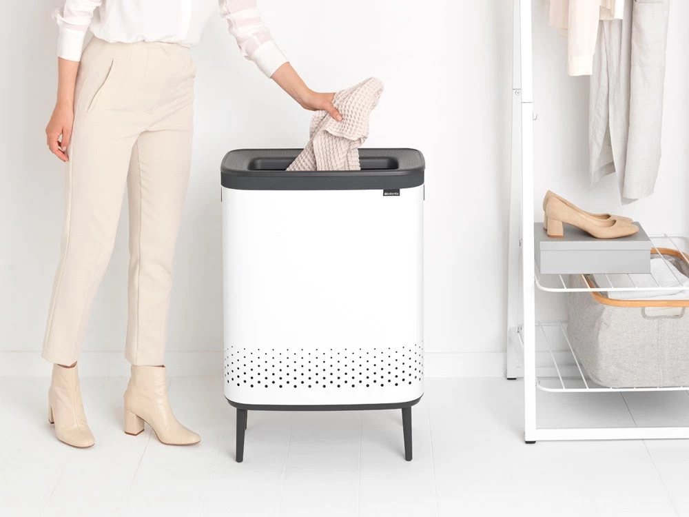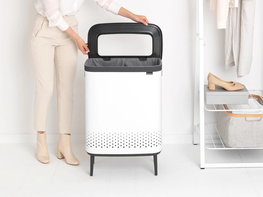 Brabantia maakt van wasdag een prachtige dag met de 2×45 liter bo wasbox Hi. De bo wasmand lijkt op een kastje, en is daardoor een super decoratiestuk in je slaap- of badkamer. Maar Bo is meer dan looks alleen! De wasmand heeft de perfecte hoogte en slimme ventilatiegaten. Dankzij de Quick-Drop opening hoef je zelfs het deksel er niet af te halen om er was in te gooien en kun je flink wat wasgoed in een keer kwijt. Op wasdagen haal je het deksel eraf om de perfect passende katoenen waszak(ken) simpel te verwijderen en de was met hetzelfde gemak naar je wasmachine te brengen. Wassen met klasse!