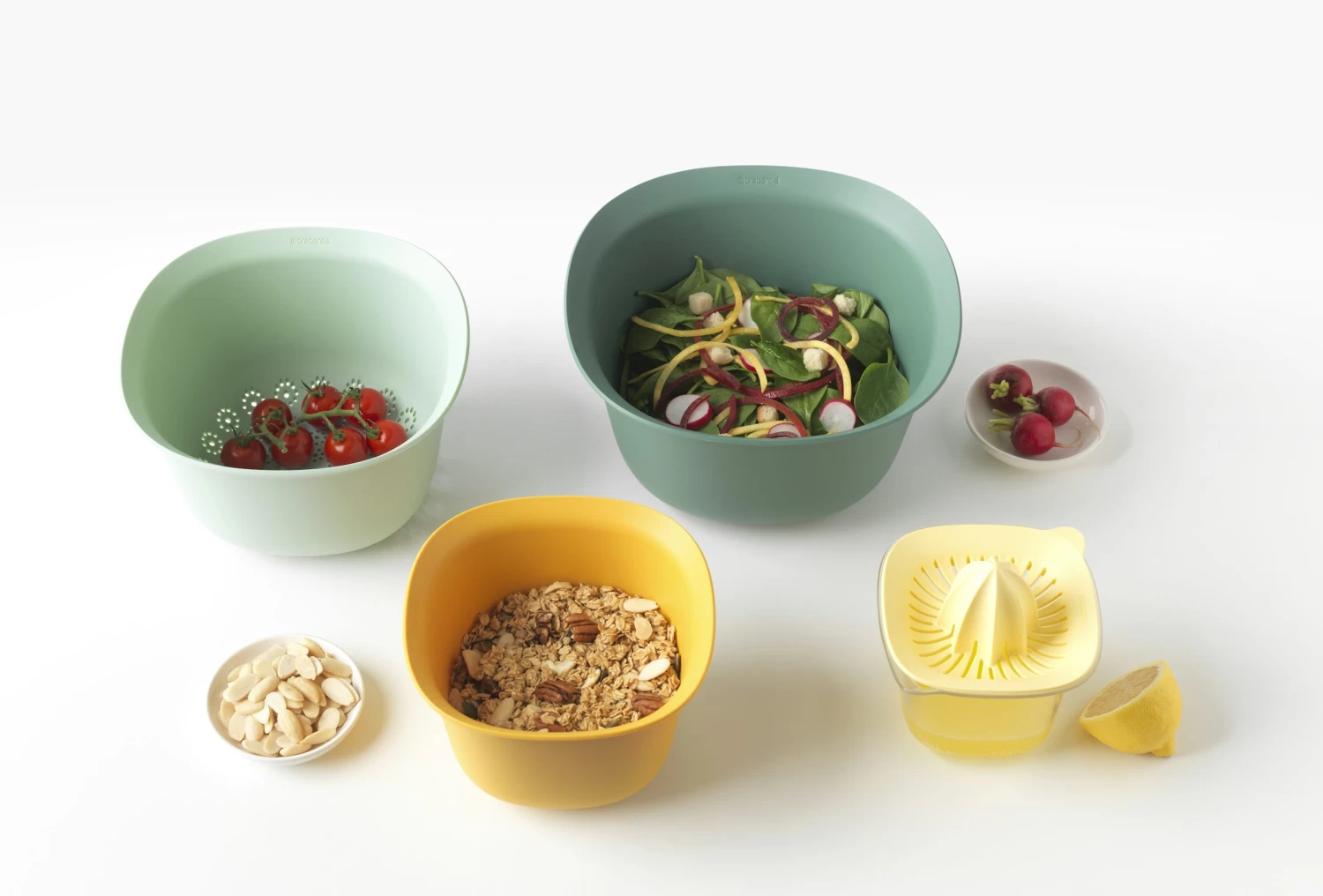 Lekker eten begint met lekker koken. Dus doe je innerlijke chef-kok een plezier met deze vrolijke, stapelbare set van twee mengkommen, een vergiet en een citruspers met maatbeker in kleuren om van te watertanden. Alles wat je nodig hebt in je keuken in een complete en ruimtebesparende set. Leuk om te geven en om te krijgen.