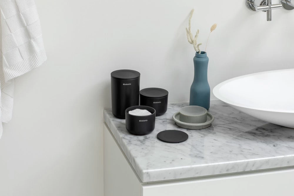 Het zijn vaak de kleine dingen die ons vrolijk maken. Zoals deze set van 3 Brabantia ReNew opbergpotjes. Twee bakjes voor haarspeldjes, oorbellen en al die andere kleine dingen die je graag bij elkaar houdt. De grotere pot is perfect voor wattenbolletjes of -schijfjes. Stapel op potjes!
