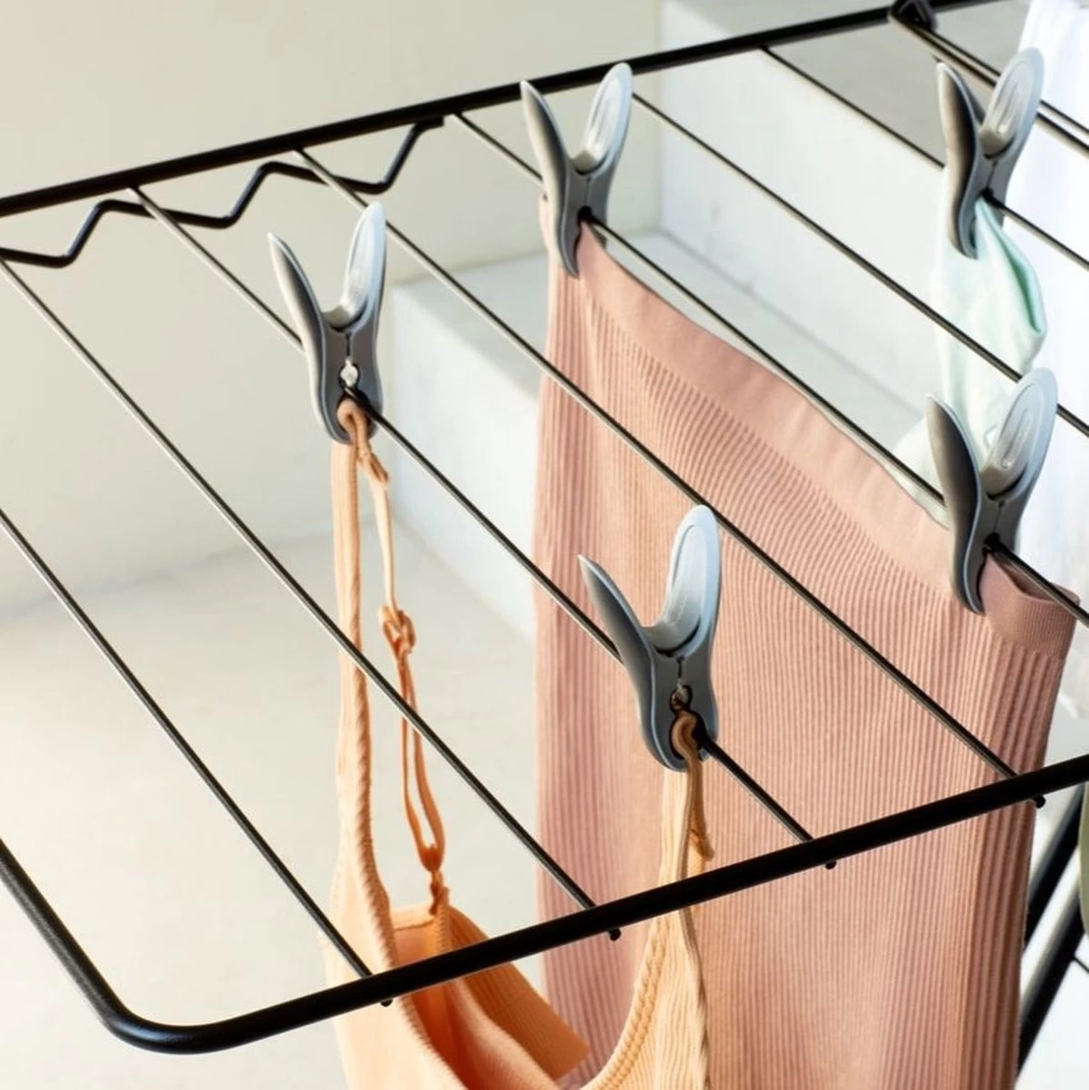 Heel makkelijk je was ophangen met Brabantia Wasknijpers – 8 stuks – Black/Grey. De slimme wasknijpers zijn ideaal voor grote wasitems en zijn van 100% kunststof, dus roestvrij. Ze hebben een grote bek, maar die gebruiken ze alleen om stevig grip op je was te houden, zonder afdrukken achter te laten! Een set bestaat uit 8 stuks, in de kleuren Black/Grey.